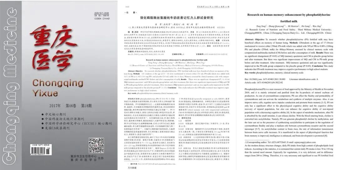 试验证明,PS奶对学生记忆力有显著的改善和提高作用。这项试验报告发表在了《重庆医学》2011年10月第40卷第30期。